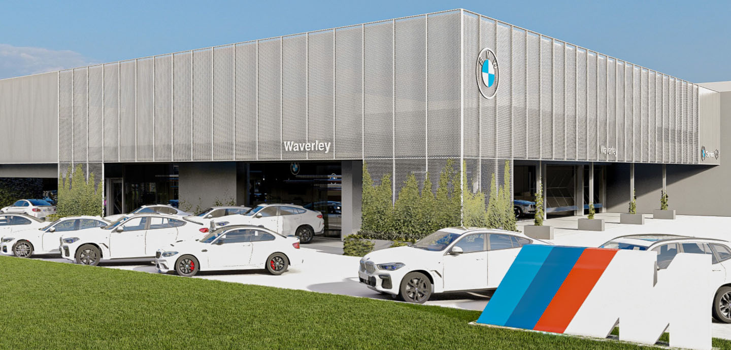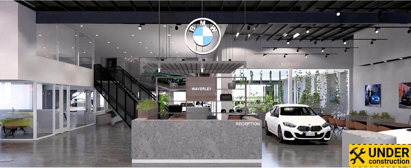 2024, Long Contracting were engaged to undertake a full internal renovation and installation of a new 8m high feature façade at BMW Waverley. The works include new concrete overlay floors throughout, feature ceilings, lighting and power upgrades, and major external civils and landscaping works.