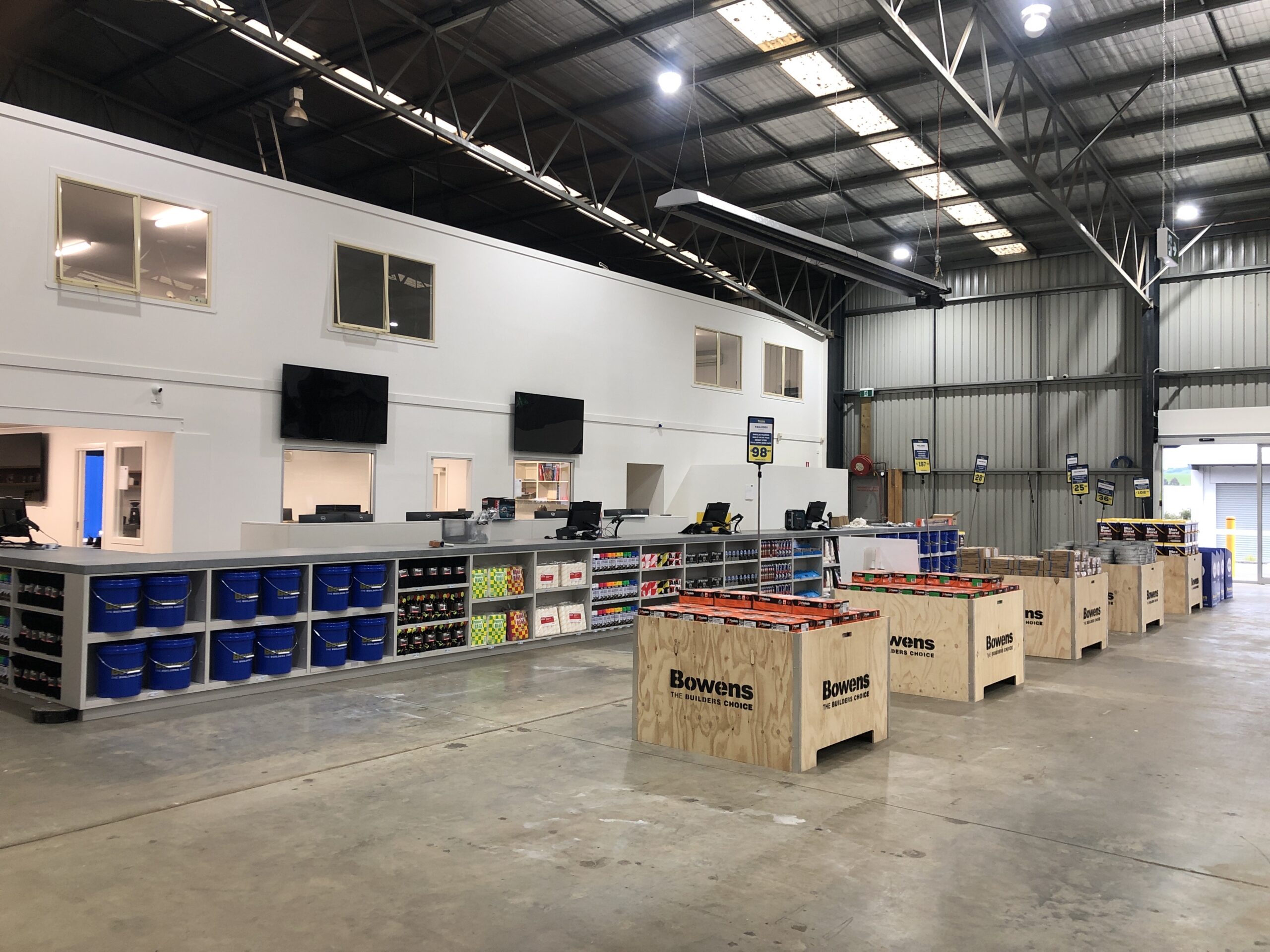 Long Contracting were engaged to transform an existing Bunnings warehouse into a state of the art Bowens store. The scope of works included demolition of lightweight internal structures, erection of a 9m high cool room panel wall to divide the existing showroom, new joinery throughout, internal and external painting, boom gates and roller doors, an additional dispatch structure and landscaping. The works were completed in 10 weeks.