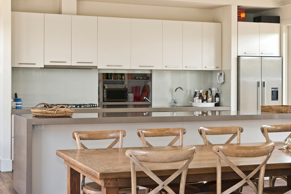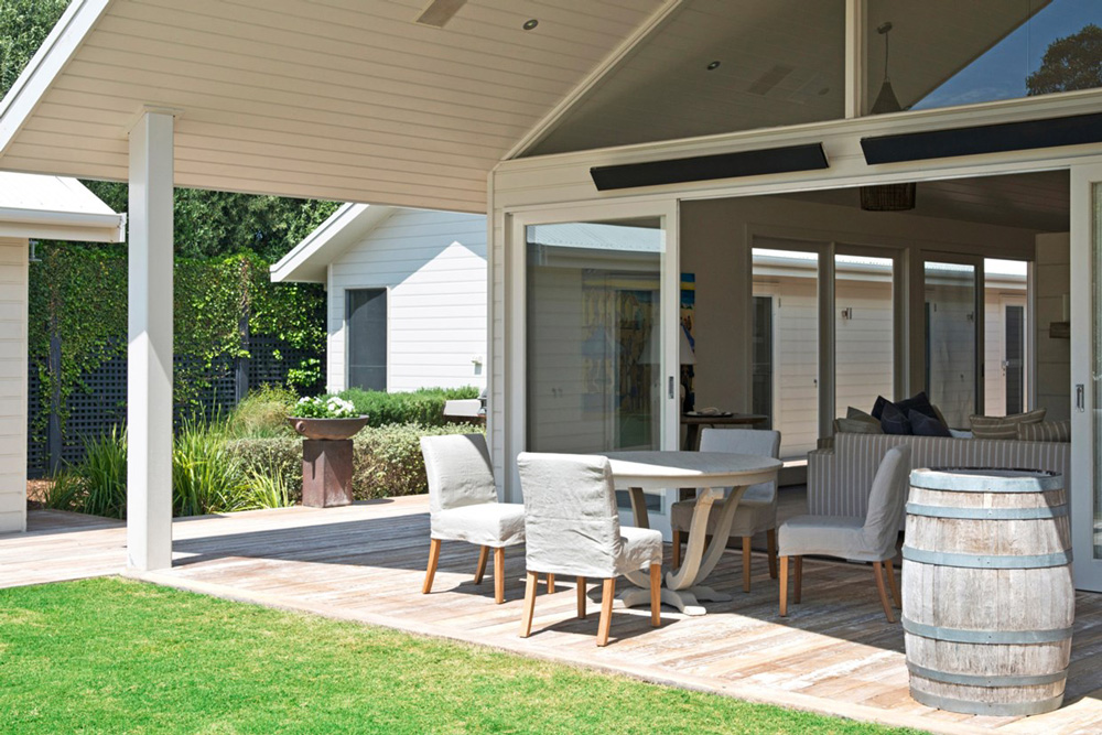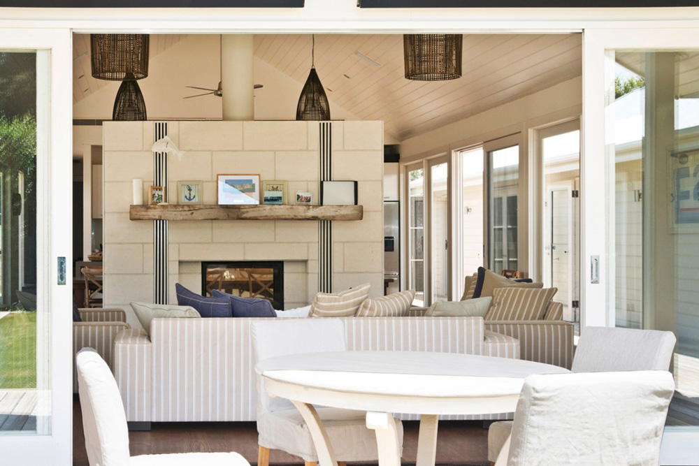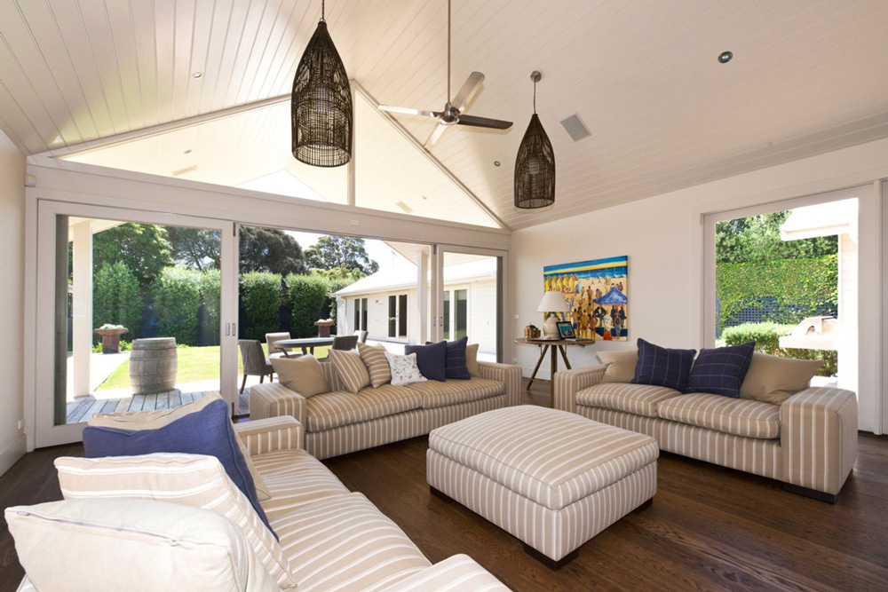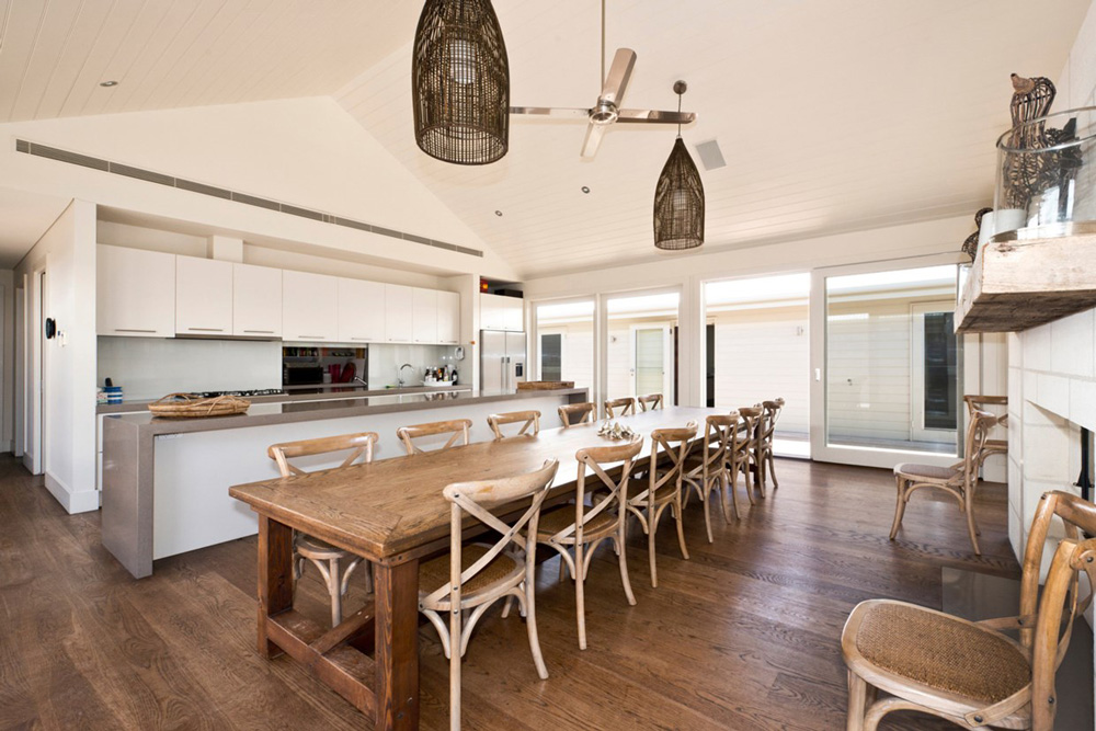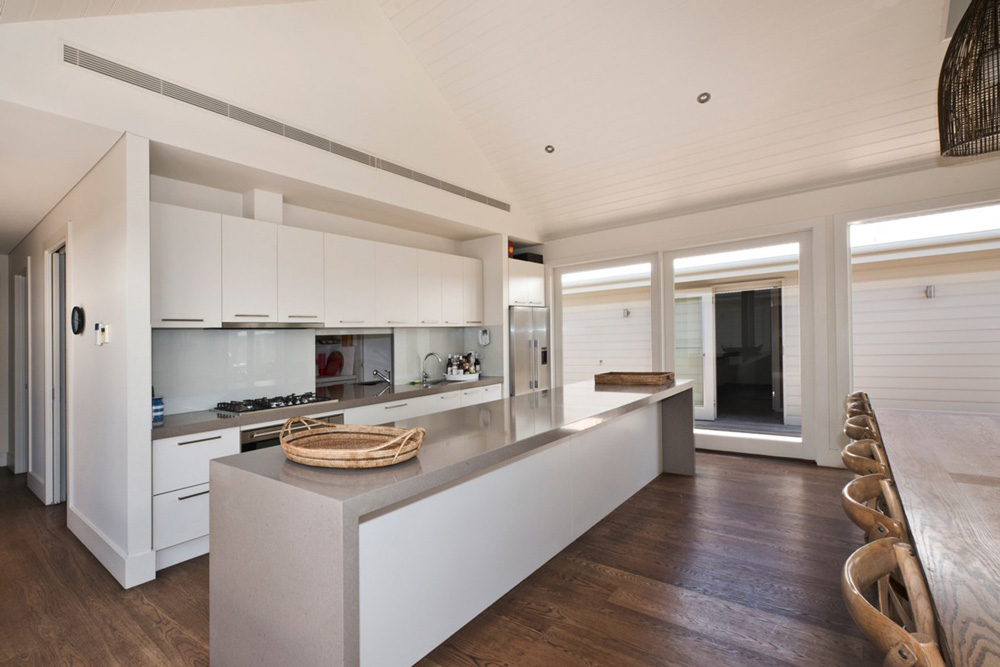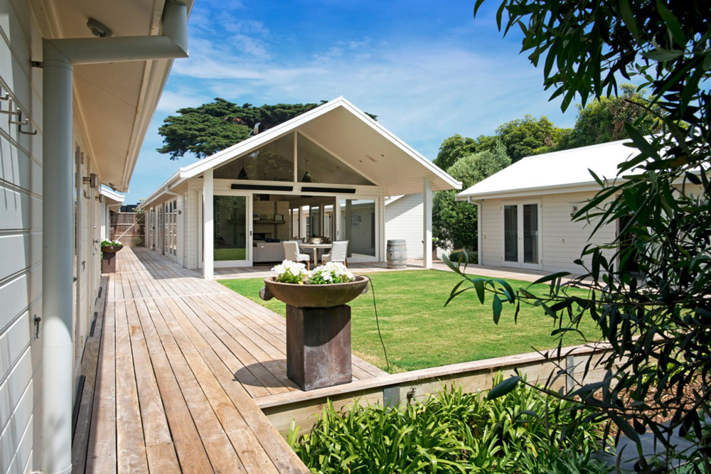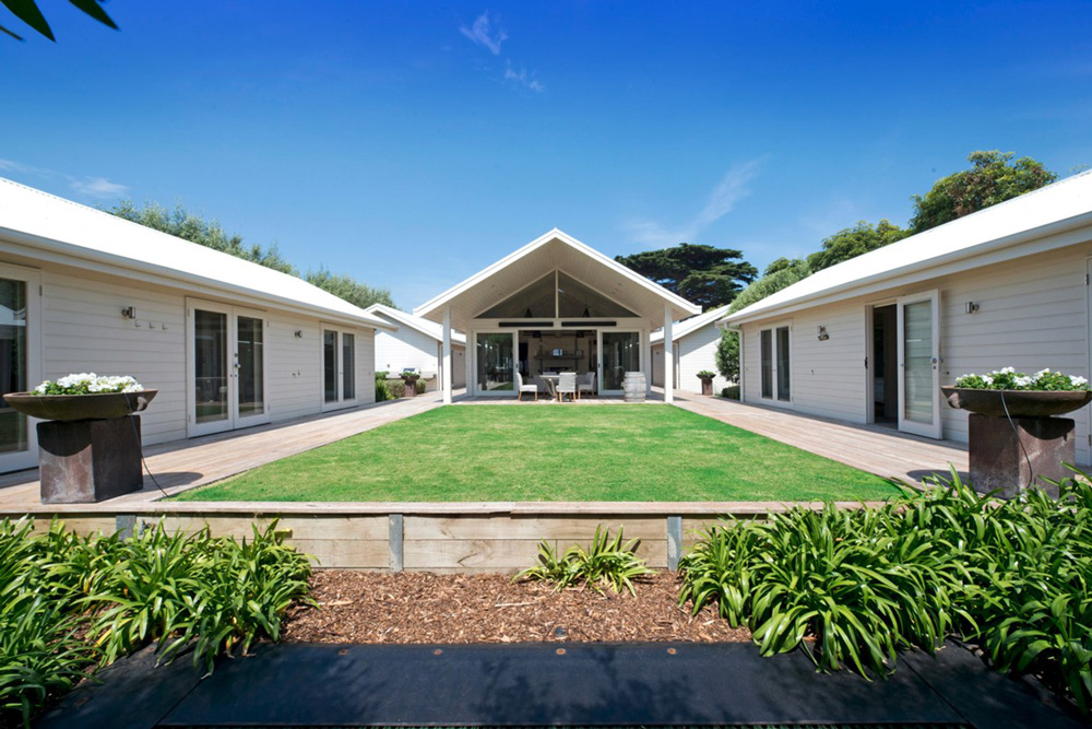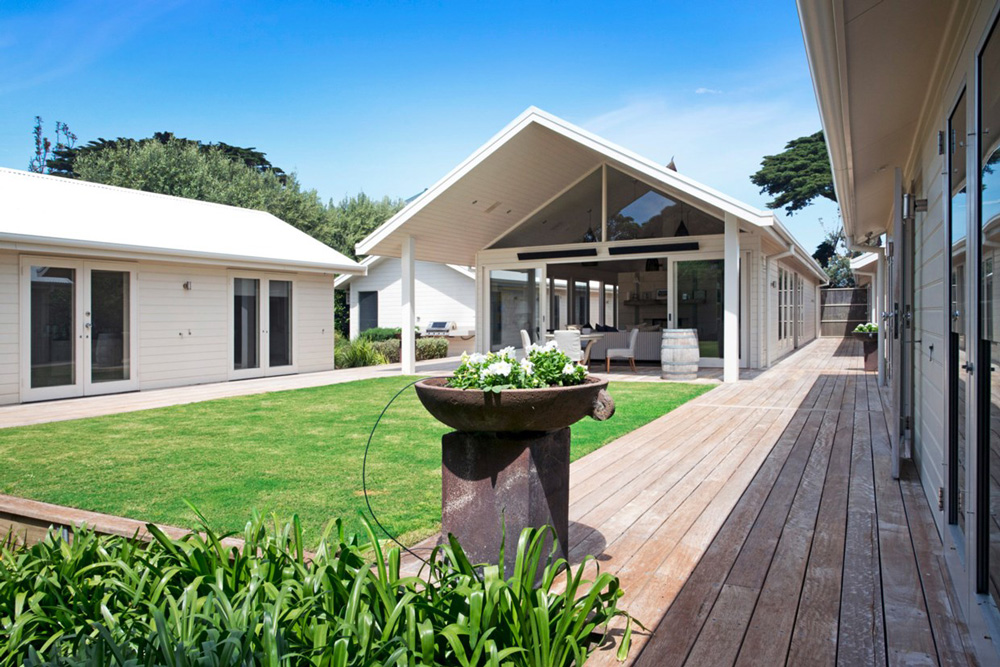 Architecturally designed by Ashley Lochhead Architects this beach house caters for extended family accommodation. Four individual pavilions are located around central living and dining areas. Local limestone feature walls and extensive use of spotted gum decking are showcased in soft landscaped areas.